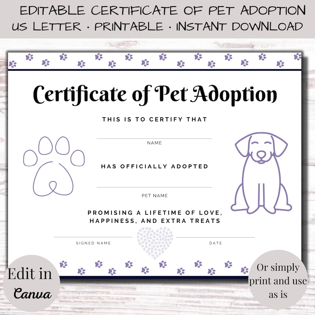 Editable Pet Adoption Certificate Dog Certificate Adoption Sign Pet Adoption Printable Custom Adoption Certificate Etsy