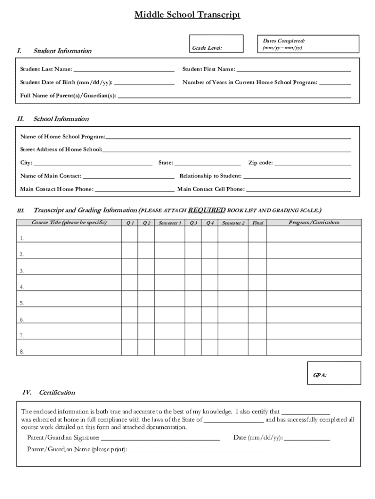 Homeschool Middle School Transcript Fill Online Printable Fillable Blank PdfFiller