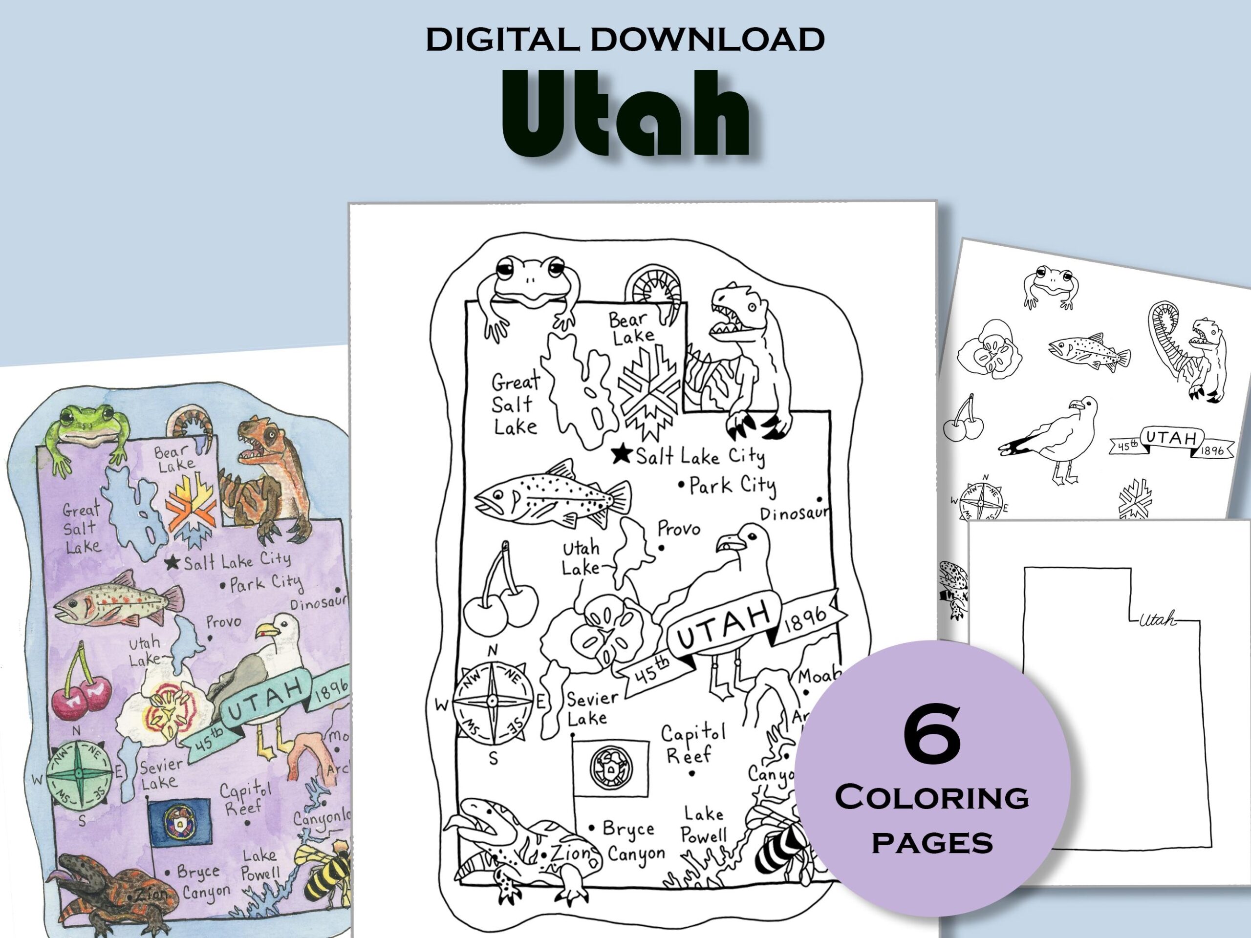 Utah Coloring Page Printable State Map Worksheet Travel Poster Print Education Sheet USA Geography Kids Activity Book Etsy