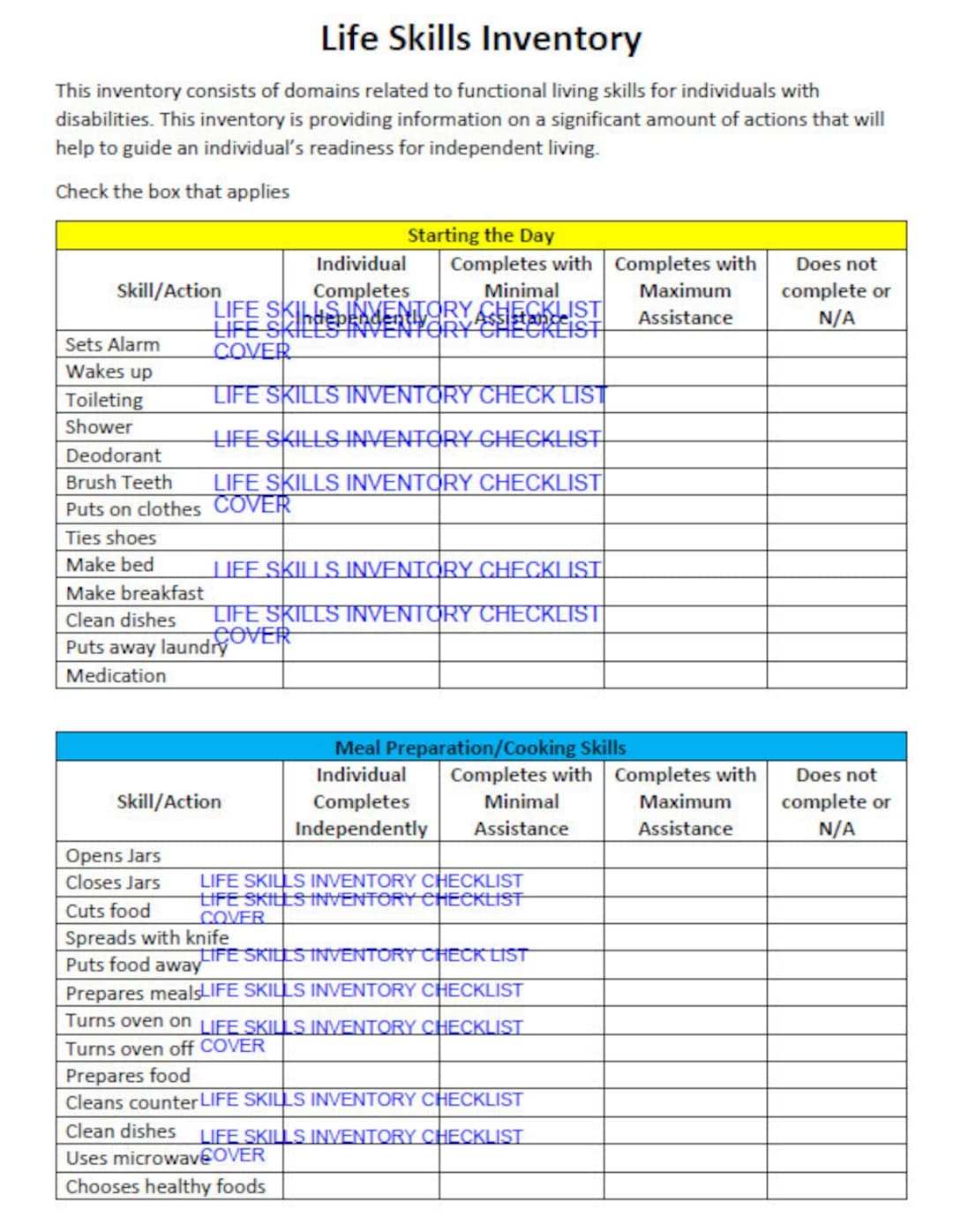 Life Skill Inventory Checklist Life Skills Assessment Transition Assessment Etsy